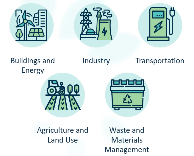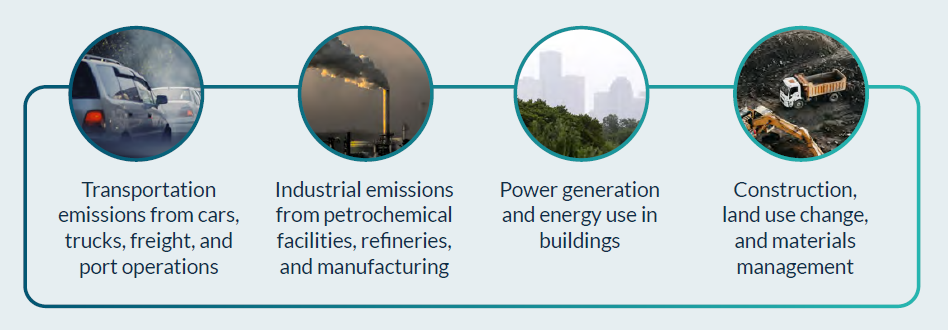 • Transportation (cars, trucks, freight, port activity, etc.) • Industry (petrochemical facilities, manufacturing, etc.) • Energy (buildings, power generation, etc.) • Construction, materials management, waste, etc.