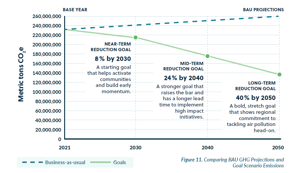 The Clean Air Action Plan establishes regional emissions reduction targets to help track progress toward cleaner air and lower greenhouse gas emissions. These targets provide a framework for measuring regional progress and aligning actions across sectors.