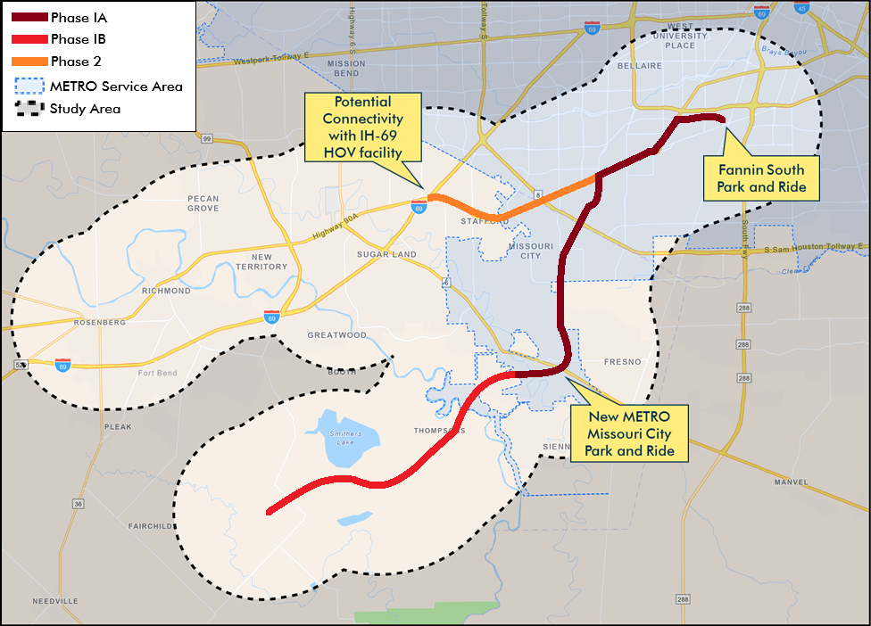 This map shows the US 90A Transit Study's recommendation: a three-phased approach for implementing High-Capacity Transit within the US 90A Corridor. The first phase begins at the Fannin South Park and Ride and extends westward into Fort Bend County along US 90A and the Fort Bend County Toll Road. A second phase would extend it across the Brazos River to the Grand Parkway, where significant development is anticipated to occur. In the longer term, a branch would continue along US 90A through Stafford to connect to IH-69/US 59.